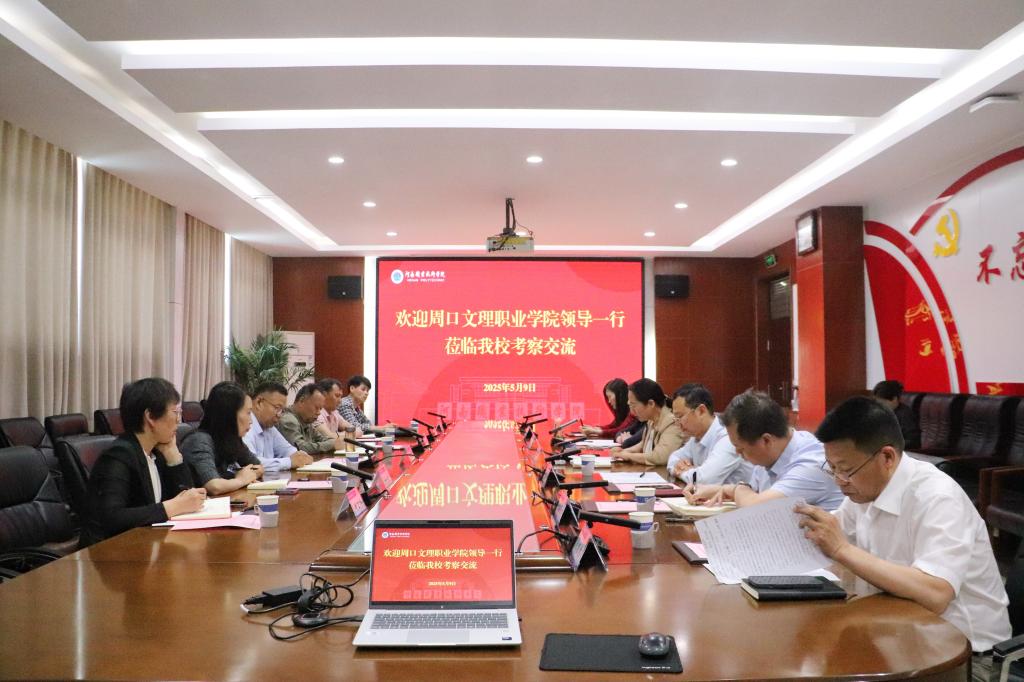 5月9日上午,周口文理职业学院党委副书记皇甫超一行来校考察交流。校党委副书记、工会主席田华,校党委委员、副校长朱永宽出席座谈会。党委学生工作部、教务处、科技开发处等相关单位负责人参会。会议由校党委委员、党委组织部部长杨华主持。
